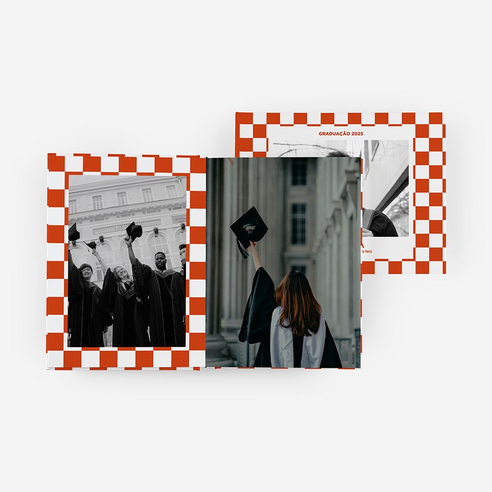 Este álbum junta o lado mais gráfico e divertido com as memórias do fim da faculdade. É uma escolha original para guardar as fotografias da universidade com um toque fora do habitual.