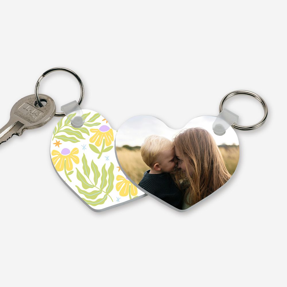 Com formato de coração e personalização total (100%) em ambas as faces, este porta-chaves transforma qualquer foto ou frase num presente romântico e inesquecível.